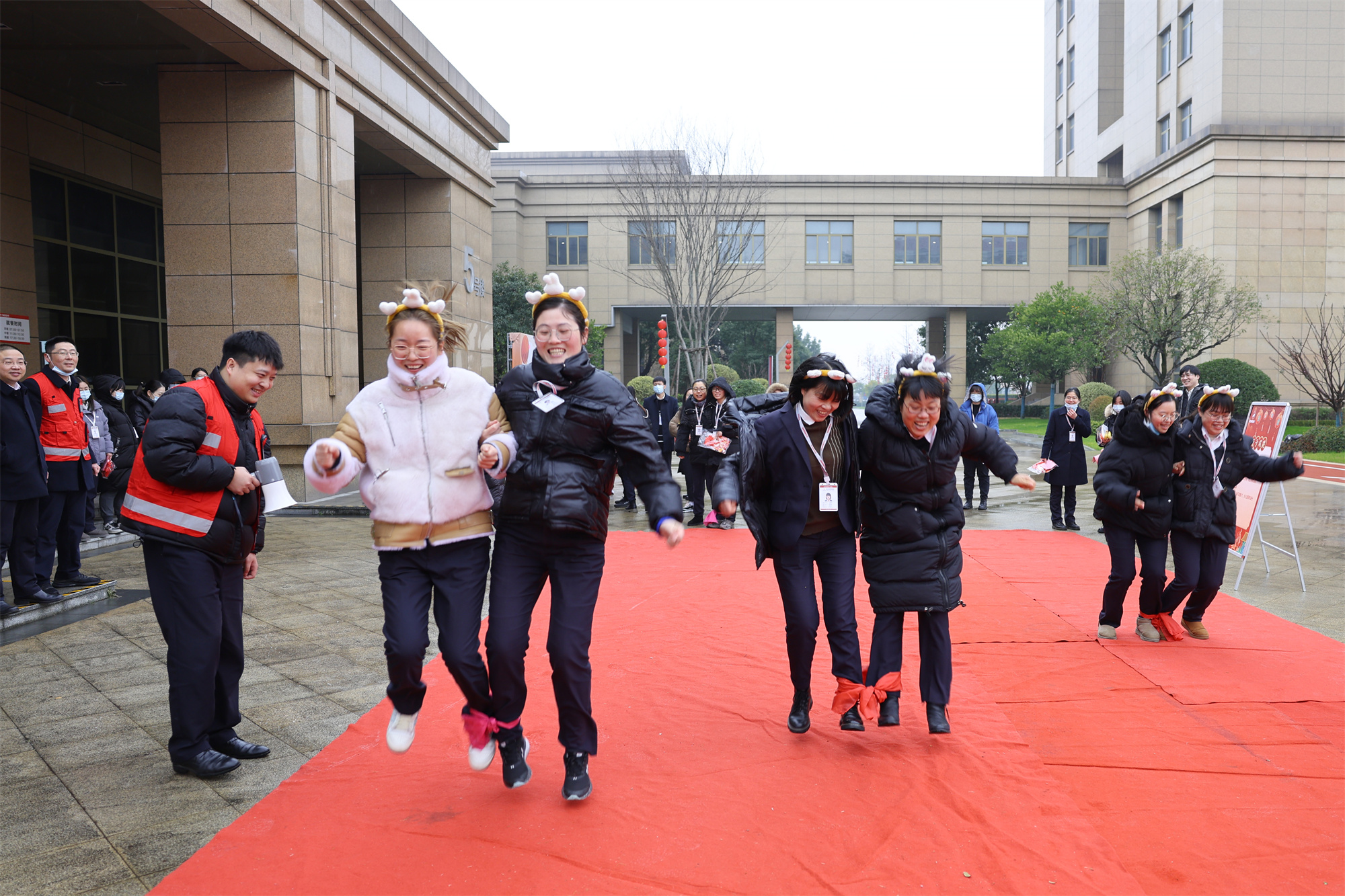 当日立春恰逢时,兔岁健步驰千里。戴上兔子发箍,以两人三足形式进行跳步前进,起步、跳跃、速度是被绑在同一条绳上三组不同参赛者显而易见的表现,运动与默契的比拼更能体现两人配合度与迎兔年的喜悦。