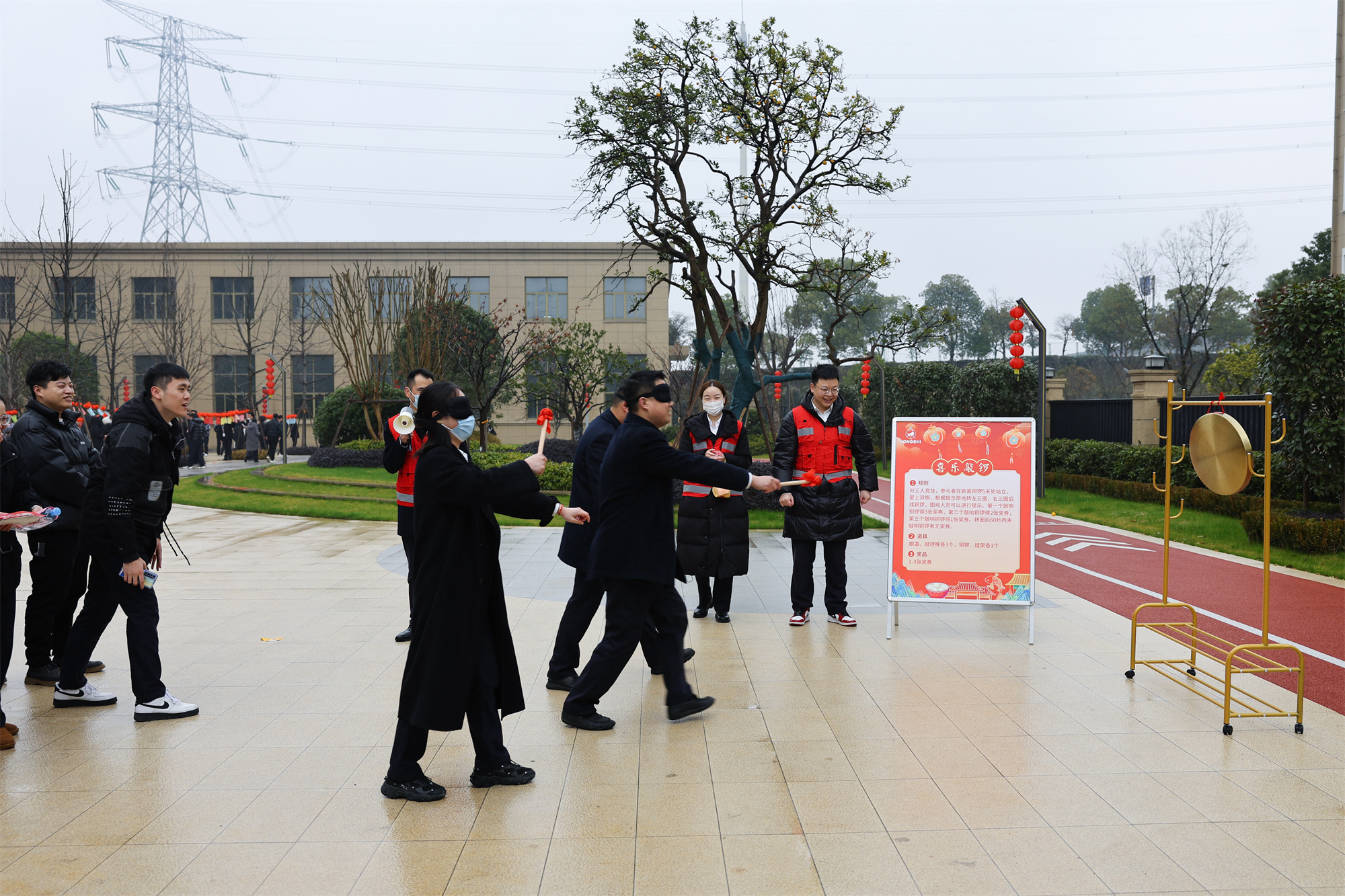 左三圈、右三圈,蒙上眼睛向前冲,铜锣被一声声敲响,那便是平衡与感官的指引,当然也不乏同事们善意的提示,第一个敲响锣鼓的与走到其他方向的参与者也都收获了相同的欢呼与笑意。