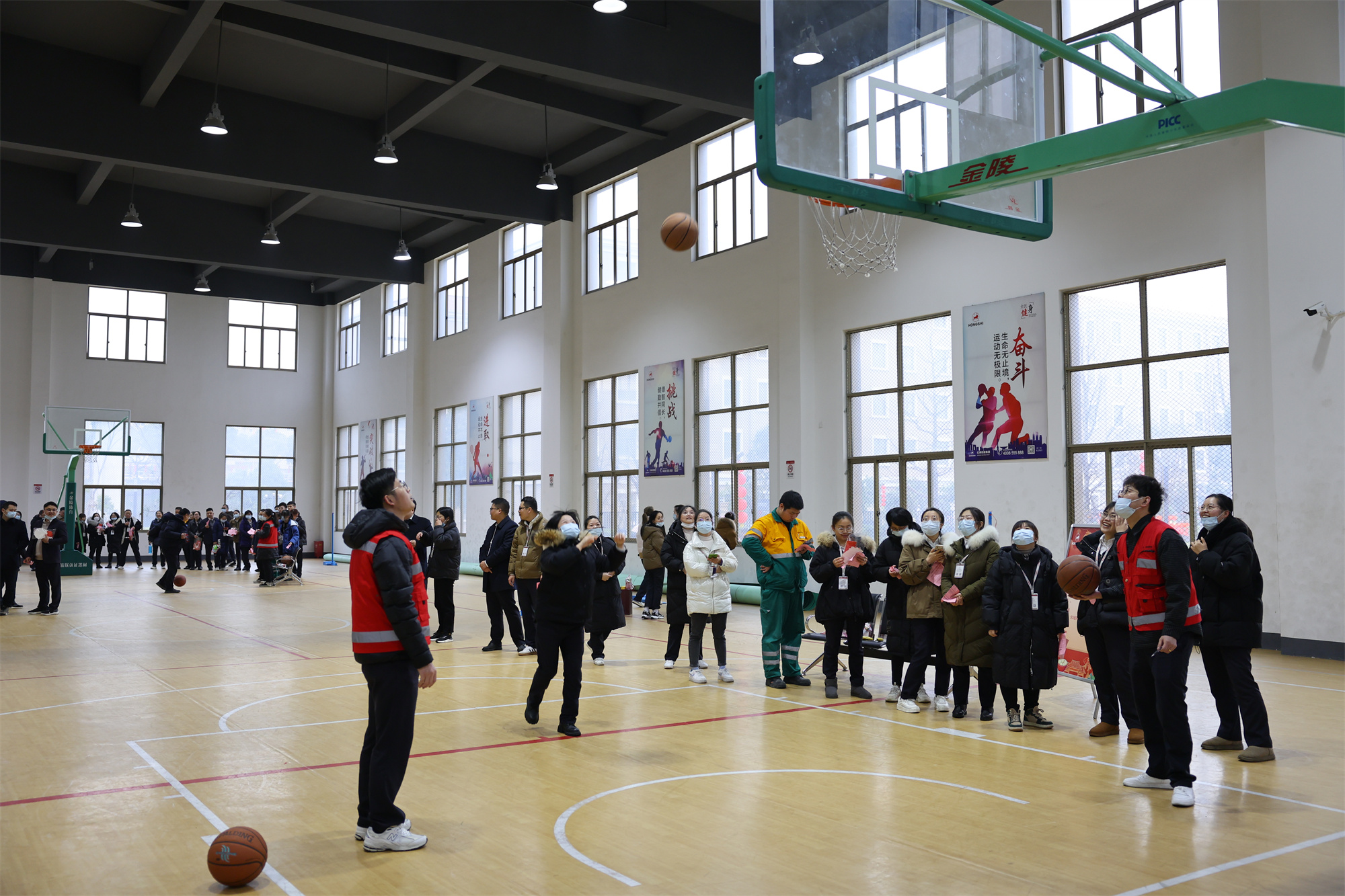 强身健体,坚持锻炼,通过“趣味投篮”、“开心托球”两个球类小比赛让大家参与到篮球与乒乓球的场地中来,罚球点处投篮球的精准度与运乒乓球跑步到终点的平衡力,都体现着参与者的体能,鼓舞声更是不绝于耳。