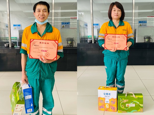 够实力,才敢与“粽”不同。比赛原计划时限为十分钟,但经过激烈的角逐,不到十分钟就风卷云残,一粒米都不剩,桌面堆满了风格各异的粽子。由围观群众共同组成“粽情组”将包好的粽子进行收取,对粽子大小适中、均匀,四角不露馅、捆扎整齐、不松线、个数等进行综合评比,最终设备科连良超、财务科田秀珠包得又好又快又多,赢得围观群众啧啧称赞,毫无悬念分别荣获了男组、女组的“一代粽师”称号,颁发荣誉证书一本、精美奖品一份。独乐乐不如“粽”乐乐,公司也贴心地为其余参与比赛的粽师们准备了礼物;大家收获了奖品,更收获了快乐。